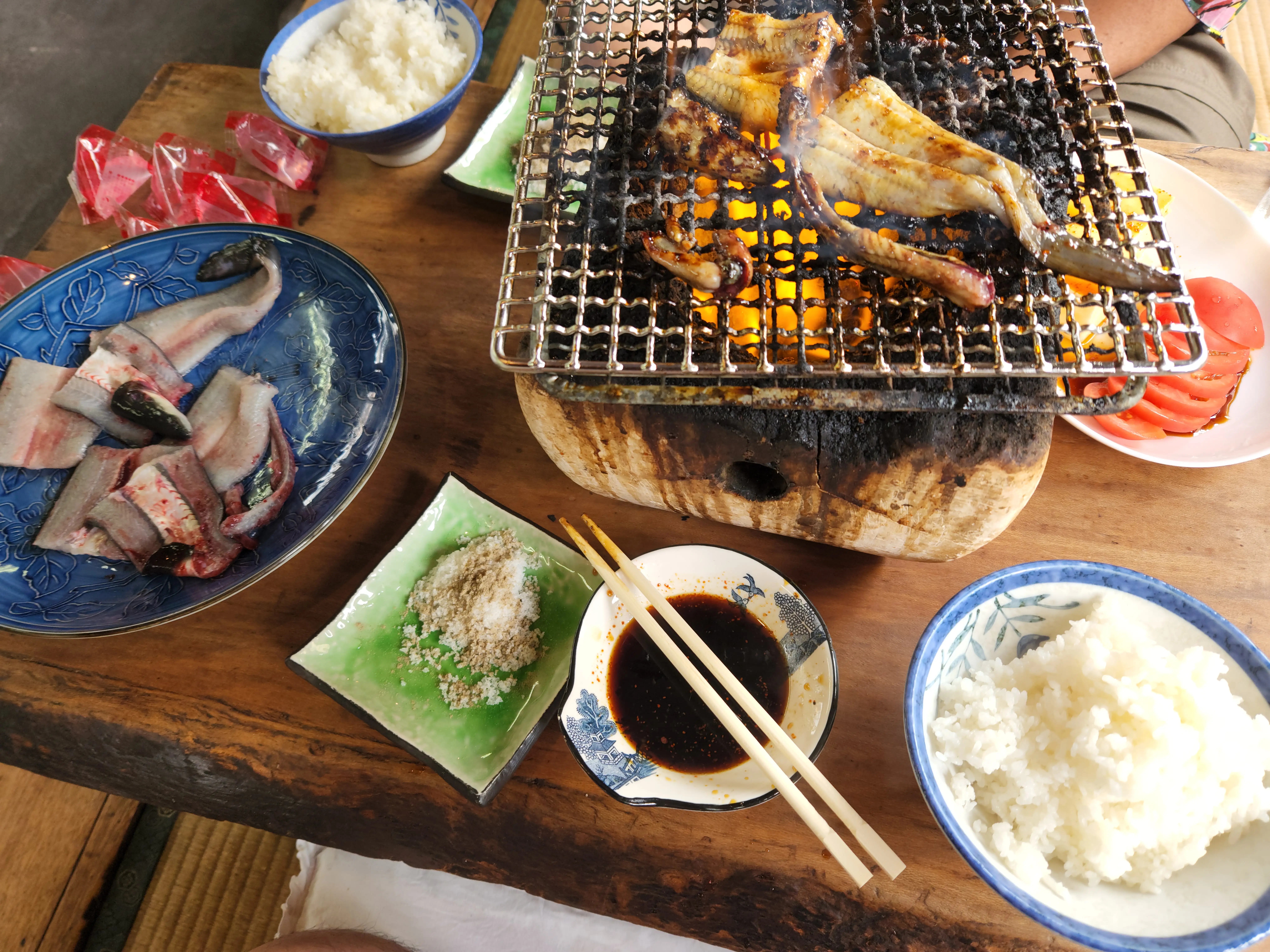 - Preparation: The eels are cleaned and cut, ready for the grill.